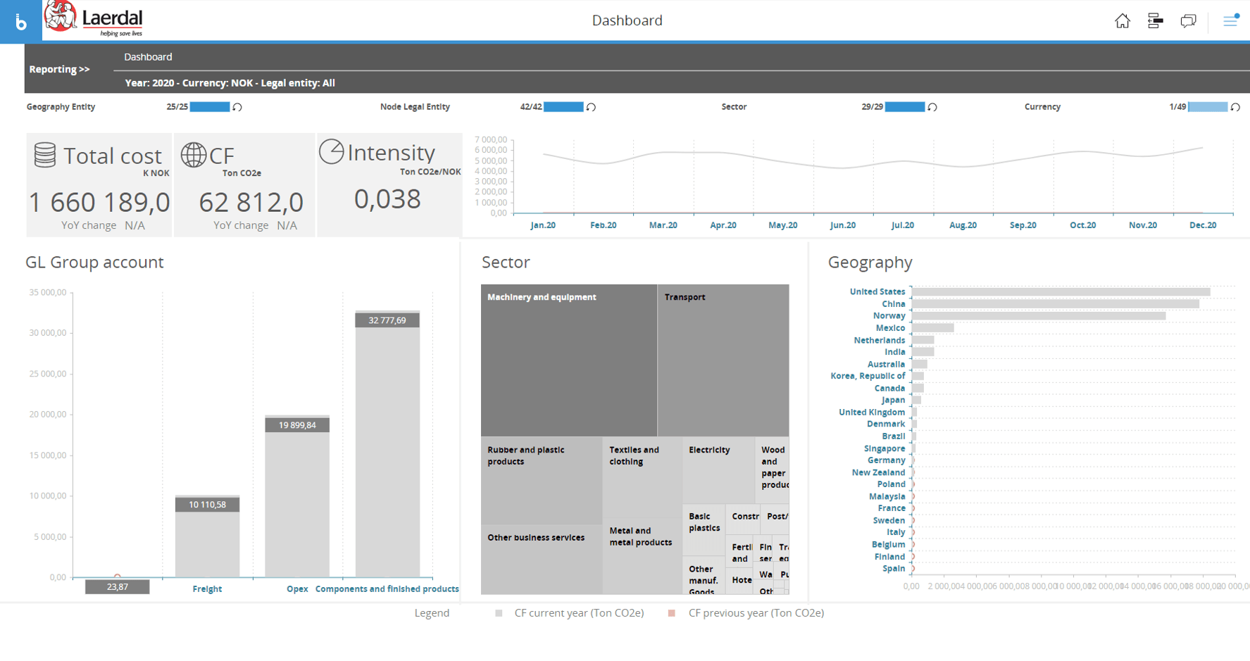 Resultatene fra systemet oppsummeres i et interaktivt dashboard (under) som gir de ulike brukerne i firmaet innsikt i hva som bidrar til klimafotavtrykk. Man kan også filtrere og drille ned i resultatene på samme måte som man vil kunne for økonomiske tall.