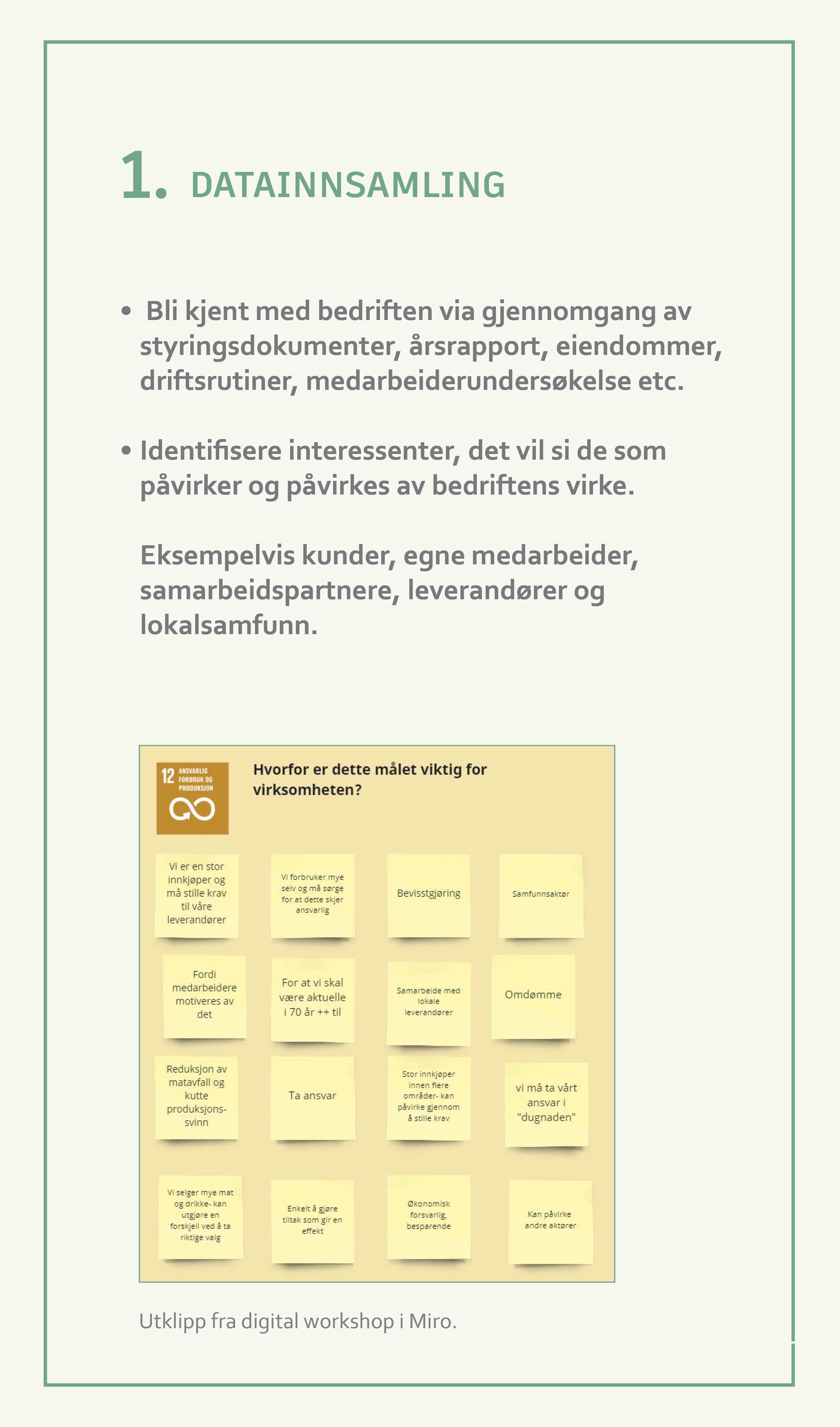 Relevante bærekraftsmål og tiltak avhenger av virksomhetens karakter, størrelse og ambisjoner. I trinn 1 ser vi derfor på hva slags tjenester eller produkter virksomheten leverer, hvilke arealer den disponerer eller påvirker, og bedriftens strategi, styringsdokumenter rutiner med mer. I denne første fasen identifiserer vi også virksomhetens interessenter, det vil si de som påvirker eller påvirkes av deres arbeid. Dette kan være kunder og medarbeidere, men også kommunen eller lokalsamfunnet virksomheten opererer i, underleverandører, samarbeidspartnere og konkurrenter. Deres krav og forventninger vil i stor grad påvirke hvilke bærekraftsmål det er mest relevant for din virksomhet å jobbe videre med.