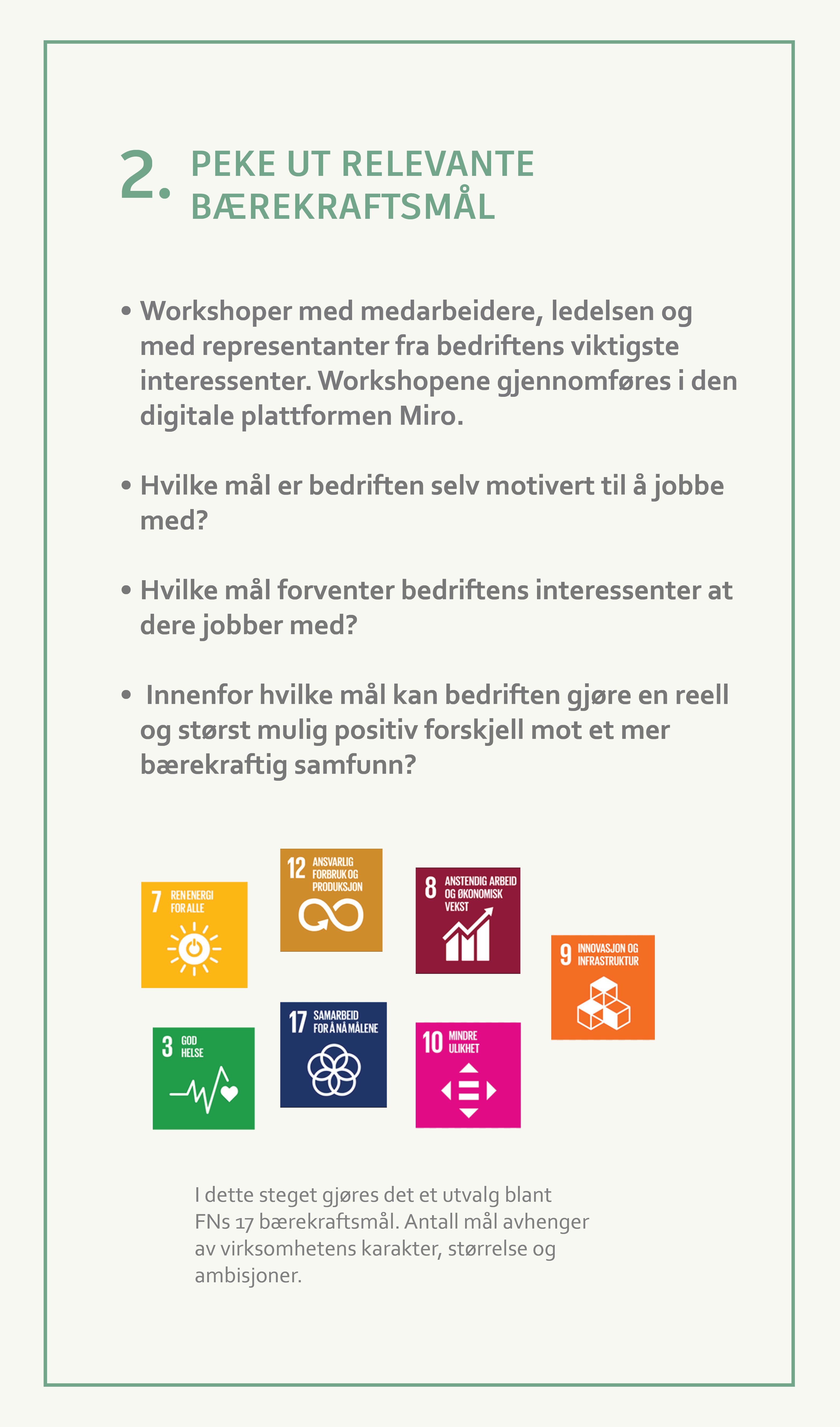 Bærekraft kan fremstå som noe abstrakt og uhåndterlig dersom man skal ta tak i alle aspekter på én gang. Det er heller ikke meningen. Din virksomhet skal legge innsatsen der hvor den har mest påvirkning. I trinn 2 gjøres derfor et utvalg blant FNs 17 bærekraftsmål. Ved hjelp av en vesentlighetsanalyse sees innspill fra virksomheten selv og dens interessenter i sammenheng med hvilke bærekraftsmål virksomheten i stor grad har mulighet til å påvirke. Dette gir grunnlag for å prioritere de mest relevante bærekraftsmålene å ta tak i til å begynne med. Over tid kan og bør strategien bygges ut med flere mål og tiltak.
