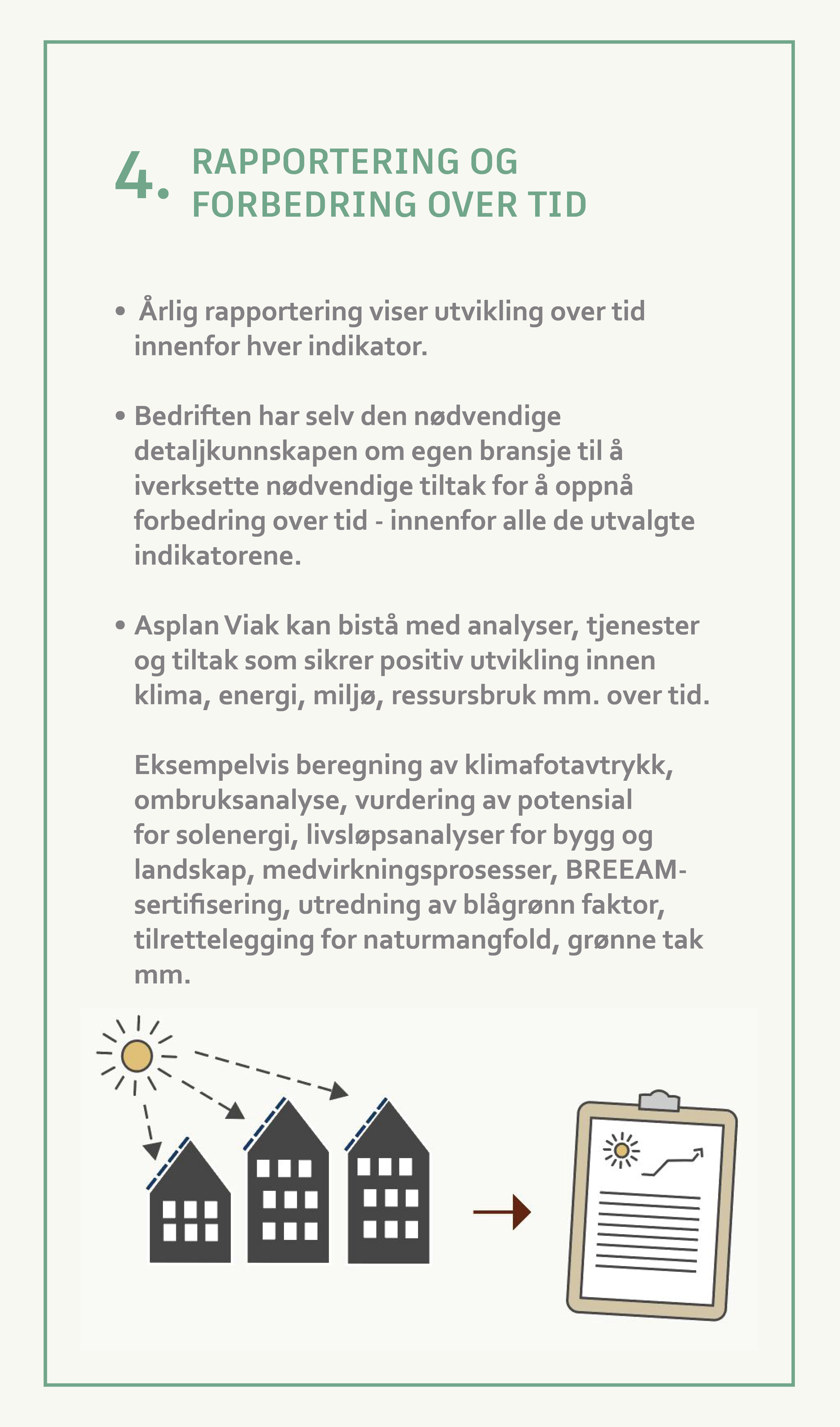 Ved hjelp av en metode i fire trinn, hjelper nå Asplan Viak offentlige og private virksomheter med å omsette det litt uhåndgripelige konseptet «bærekraft» til konkret praksis tilpasset den enkelte virksomhet. Her kreves ingen forkunnskaper. Vi tar kundene våre hele veien fra en intensjon om å ta bærekraft på alvor, til konkrete tiltak, måling, dokumentering og bærekraftsrapportering.