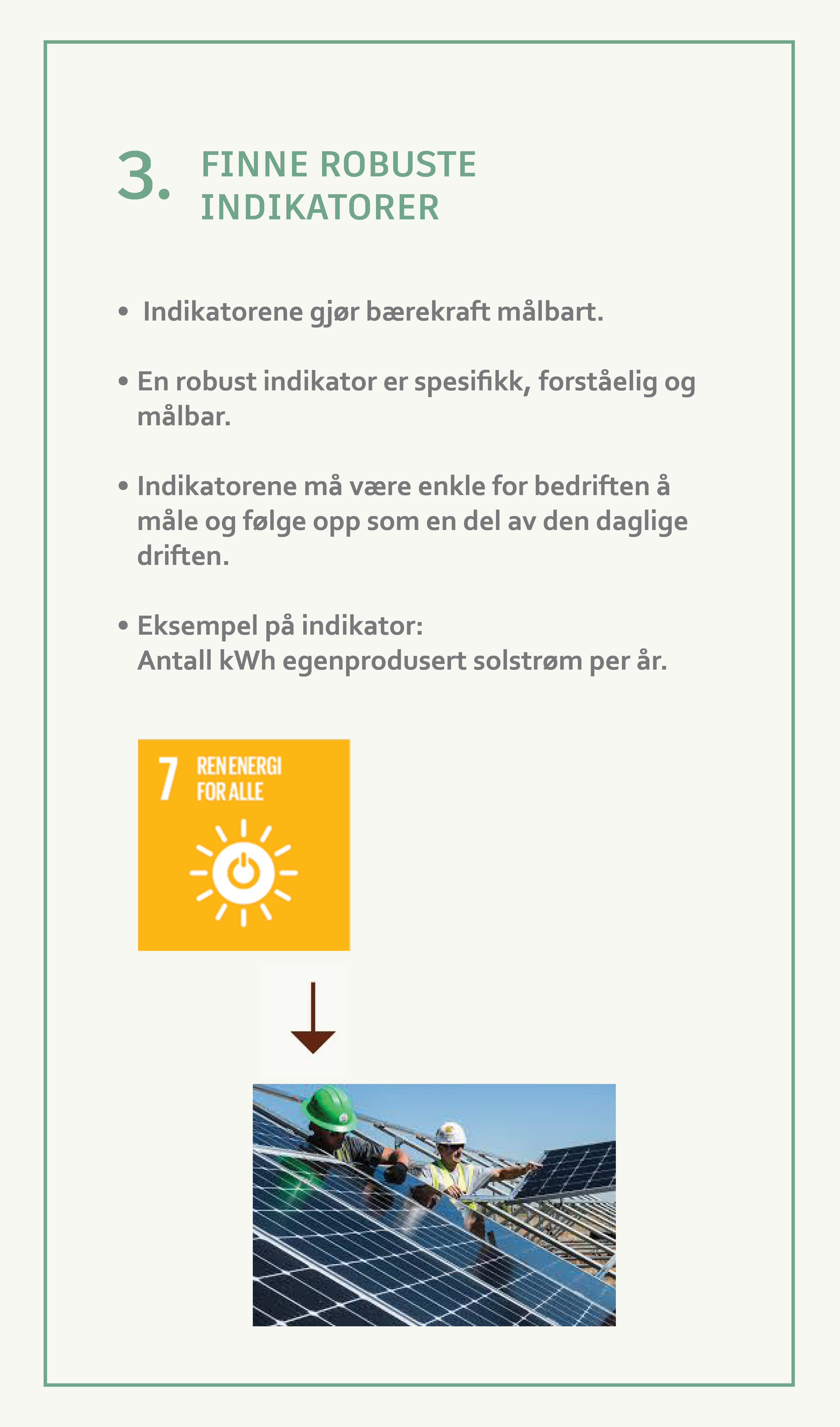 I trinn 3 gjøres bærekraft målbart ved hjelp av indikatorer knyttet til hvert av de utvalgte målene. En indikator skal være spesifikk, forståelig og meningsfull og samtidig enkel for virksomheten å følge opp som en del av den daglige driften. For å få til dette, utvikles indikatorene i tett samarbeid med virksomhetens egne medarbeidere.